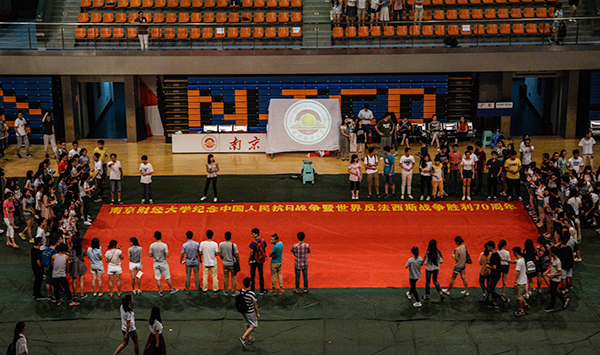 9月1日晚,“beat365英国官方网站纪念中国人民抗日战争暨世界反法西斯战争胜利70周年”活动在beat365仙林校区体育馆举行。本次活动由党委宣传部、校团委、体育部联合举办,校学生会、研究生会等学生组织共同协办。校、院团委全体工作人员及16个学院的1000多名学生参与了活动。