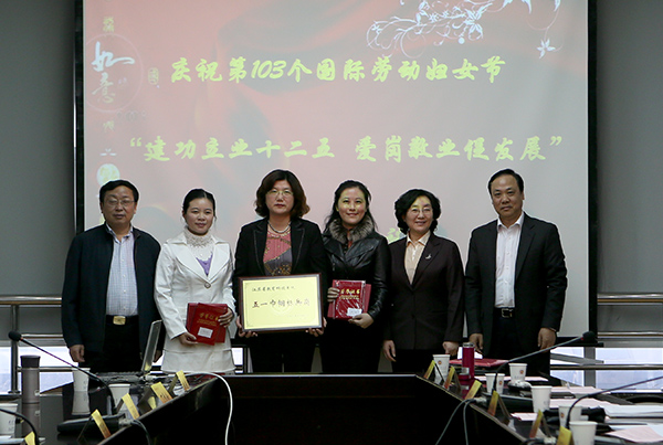 校工会主席高再飞宣读了《关于表彰江苏省教育科技系统“五一巾帼标兵岗”、“五一巾帼标兵”的决定》:beat365国际合作与交流处被评为江苏省科技系统“五一巾帼标兵岗”,财务处副处长姚文韵、会计学院贺伊琦老师获得江苏省教育科技系统“五一巾帼标兵”荣誉称号。校领导陈章龙、程光熙、鞠兴荣为获此殊荣的集体和个人颁奖并合影留念。