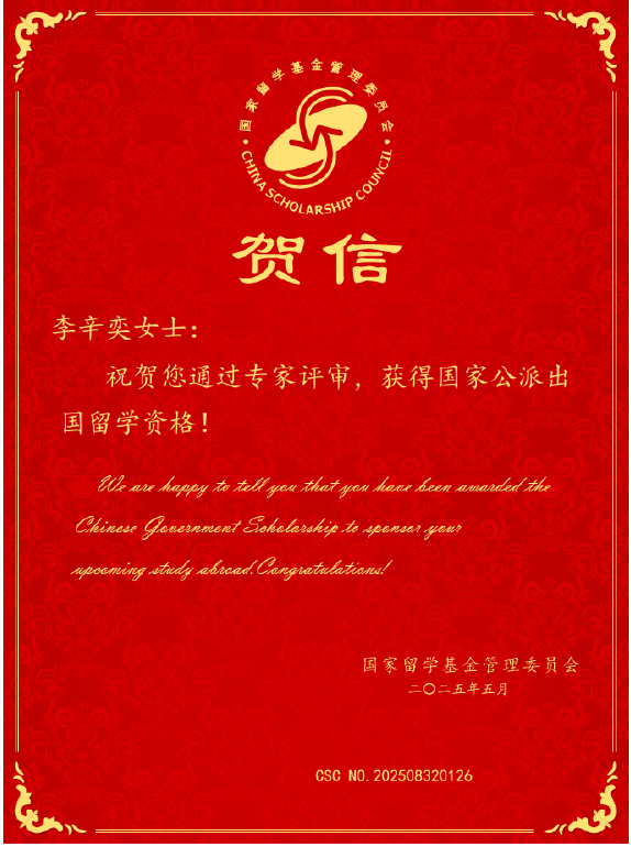 近日,国家留学基金管理委员会公布了2025年国家建设高水平大学公派研究生项目录取名单,beat365食品科学与工程学院2022级硕士研究生李辛奕凭借扎实的专业基础和突出的科研能力,成功入选该项目,即将前往全球食品科学与工程专业排名第五(2024年软科世界一流学科排名)的美国马萨诸塞大学阿默斯特分校攻读博士学位。