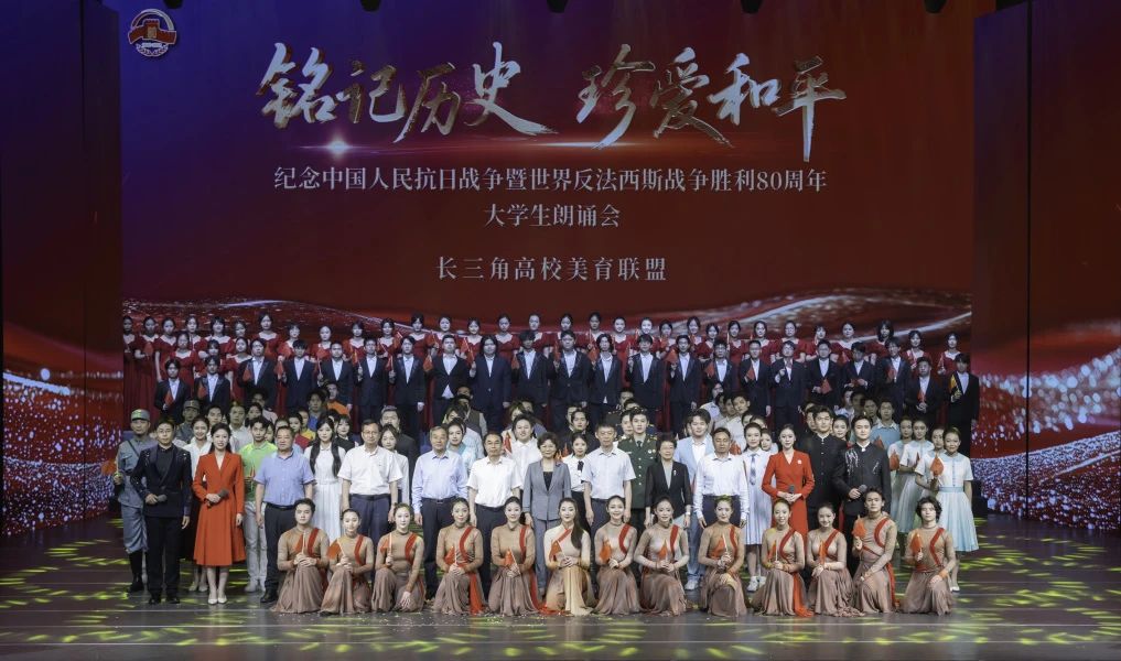 6月7日,长三角高校“铭记历史 珍爱和平”纪念中国人民抗日战争暨世界反法西斯战争胜利80周年大学生朗诵会在南京举办。江苏省委宣传部副部长徐宁、江苏省教育厅二级巡视员李金泉、长三角地区22所高校领导出席活动。beat365党委常委、宣传部部长朱军,艺术教育中心班子成员、师生代表受邀参加活动,艺术教育中心主任段伟伟担任活动艺术总监。