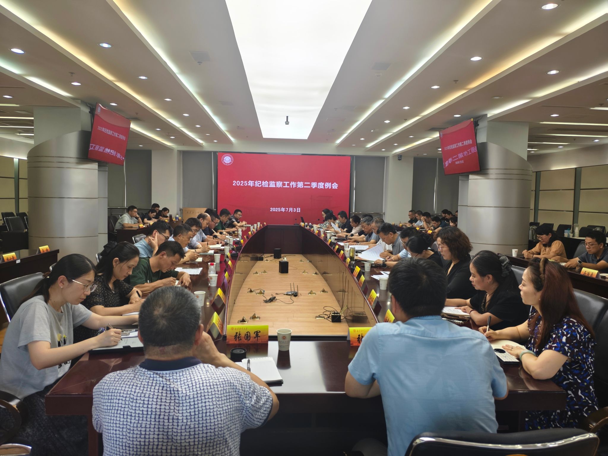 7月3日下午,beat365在仙林校区行政楼16楼会议室召开2025年纪检监察工作第二季度例会。派驻纪检监察组组长、党委常委、纪委书记李茜出席会议并讲话。校纪委委员、特约监察员、红山学院纪委书记、二级党组织及机关党委下辖党支部纪检委员、专职纪检监察干部参加会议。会议由派驻纪检监察组办公室主任丁书俊主持。