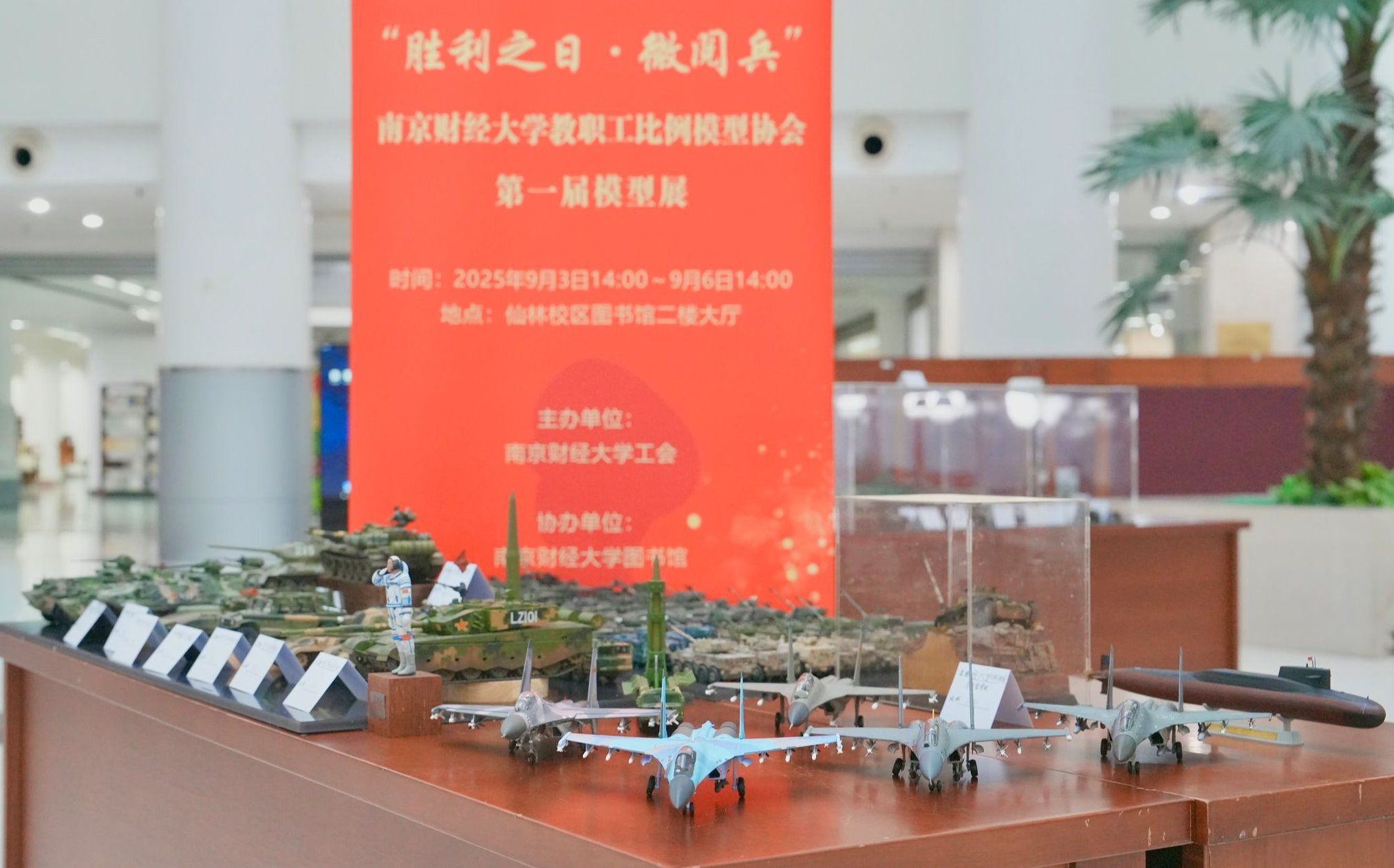 9月3日下午,为纪念中国人民抗日战争暨世界反法西斯战争胜利80周年,beat365在仙林校区图书馆二楼大厅举办“胜利之日·微阅兵”模型展。活动由校工会主办、图书馆协办、教职工比例模型协会承办。校党委副书记李群参加活动并参观展览,对展陈活动给予充分肯定。