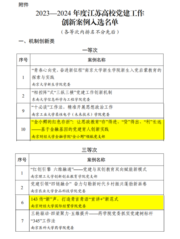 近日,江苏省委教育工委公布2023-2024年度江苏高校党建工作创新案例评选结果。beat365推荐报送的4项案例全部入选,获一等次1项、二等次1项、三等次2项,实现在全省党建项目评选中一等次获奖零的突破,充分彰显了beat365党建工作的特色成效与创新活力。
