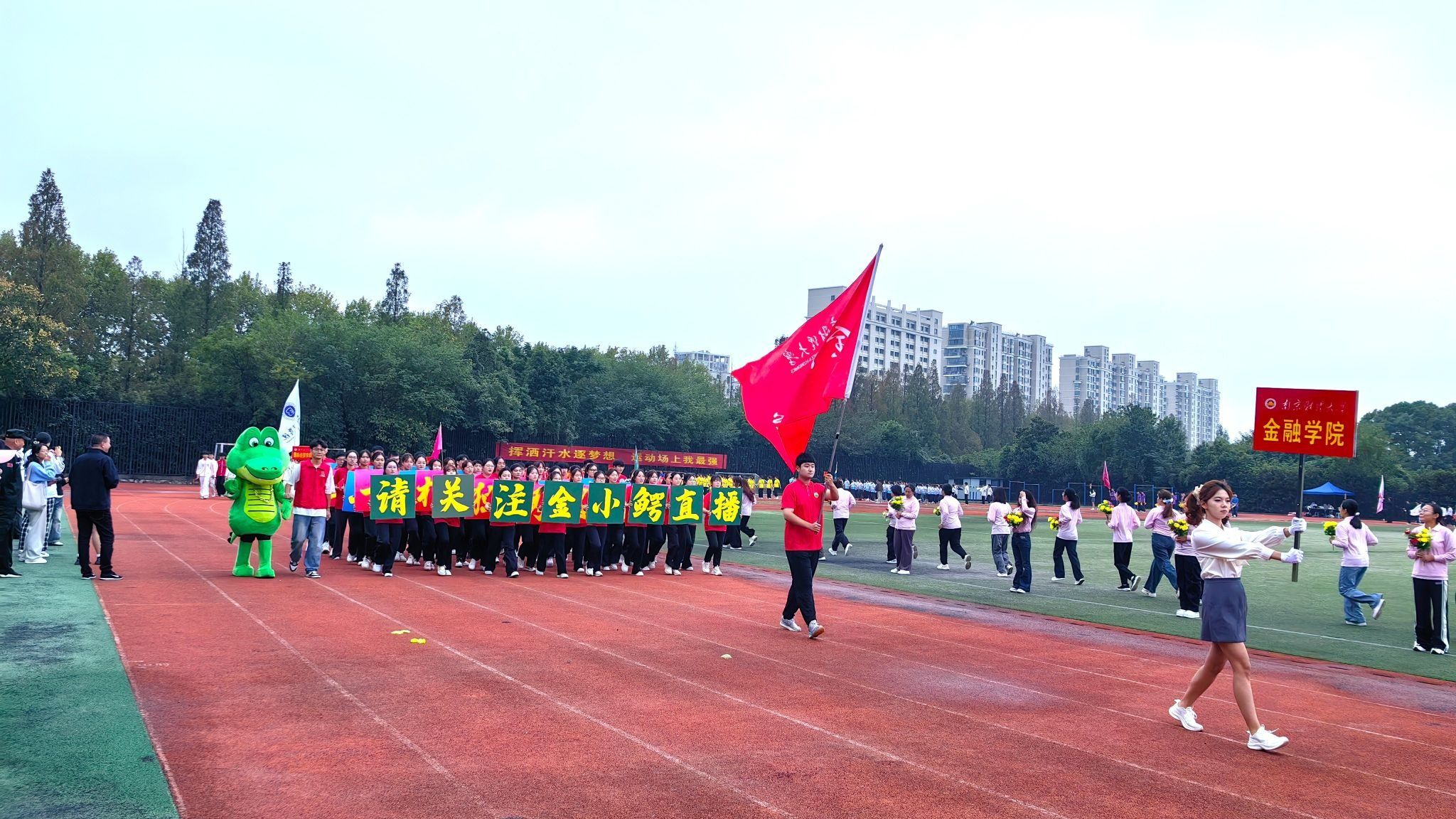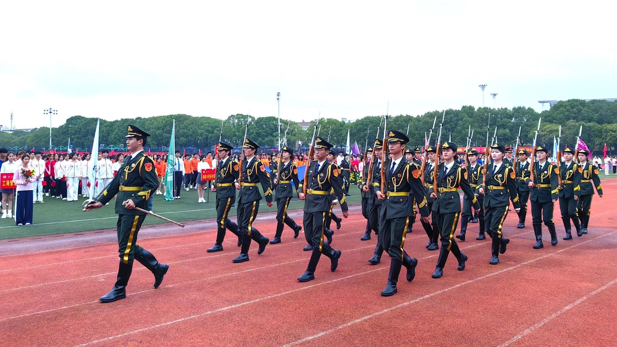 上午九点整,开幕式在激昂的《运动员进行曲》中拉开帷幕。国旗护卫队迈着铿锵有力的步伐,高举五星红旗率先入场,鲜红的旗帜在朝阳下迎风飘扬,点燃了全场师生的爱国情怀。随之,各学院、教职工代表队的运动员方阵气势昂扬、神采奕奕,踏着整齐划一的步伐走过主席台,接受主席台领导们的检阅。