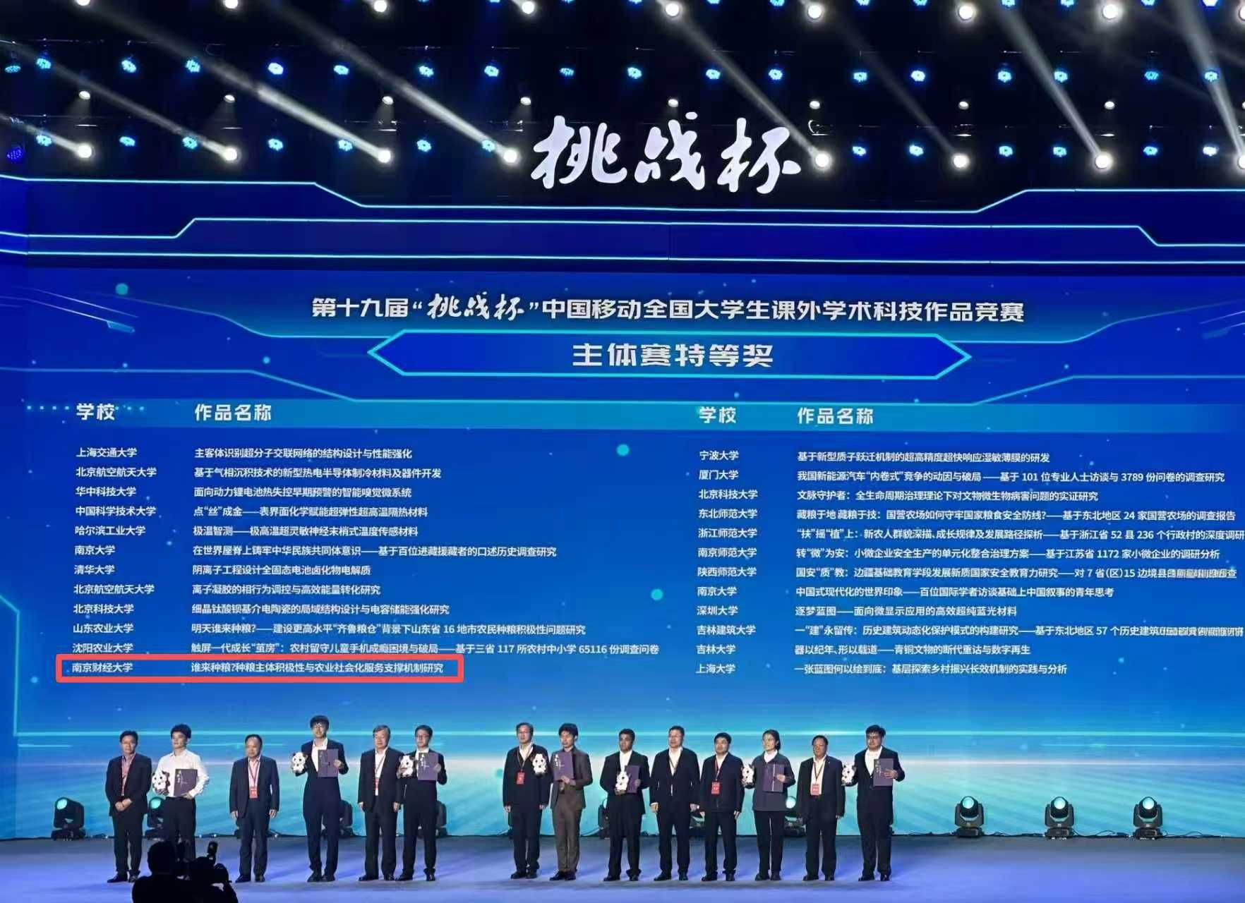 经济学院参赛作品《谁来种粮?种粮主体积极性与农业社会化服务支撑机制研究》获主体赛特等奖,食品科学与工程学院参赛作品《用于储粮害虫防治的RNA生物农药创制》获主体赛三等奖;计算机与人工智能学院参赛作品《智粮元界——大模型赋能的粮食杂质分割决策系统》《粮食医院——基于人工智能的粮食储藏健康诊疗系统》,分别获“揭榜挂帅”擂台赛二等奖和三等奖;计算机与人工智能学院参赛作品《智能移动式农业服务与智慧决策系统》获“人工智能+”专项赛二等奖。