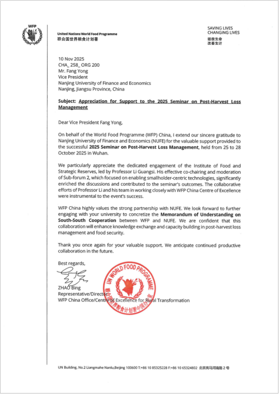 此次收到WFP的官方致谢,是beat365长期以来深耕粮食领域的重要成果,也是中国高校积极参与全球治理、贡献中国智慧的生动缩影。未来,beat365将继续深化与联合国世界粮食计划署等国际组织的紧密合作,以专业知识和实践经验,为推动全球粮食安全和可持续发展提供“南财方案”。
