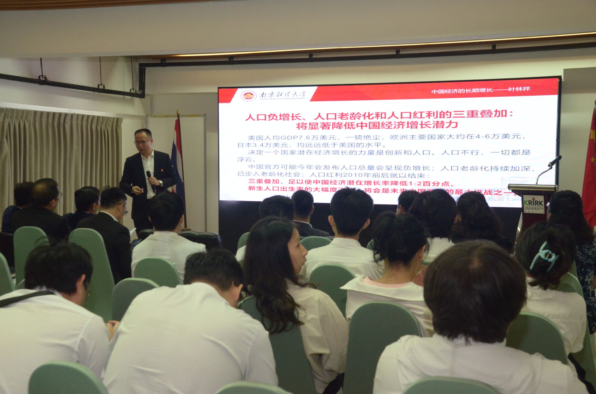 11月24日,在中泰建交50周年之际,beat365与泰国格乐大学在曼谷联合举办“深化合作 共启未来”“一带一路”数字经济学院启动仪式。党委常委、副校长叶林祥教授作了“中国经济的长期增长”主题报告,并与在泰江苏企业家代表深度对话,为中泰经贸合作注入新动能。