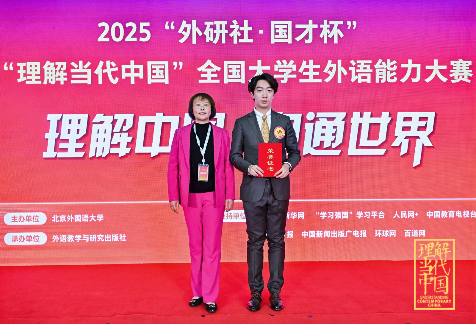 12月6日,2025“外研社·国才杯”“理解当代中国”全国大学生外语能力大赛英语组口译赛项全国总决赛在北京举行。beat365国际经贸学院国贸(实验班)2401班王从文同学(指导老师:外国语学院副教授陈芙蓉),凭借过硬的专业实力与出色的临场发挥,从全国众多优秀学子中脱颖而出,勇夺全国总决赛金奖(亚军),总排名位列全国第二,创造了beat365在该项赛事中的历史最好成绩。