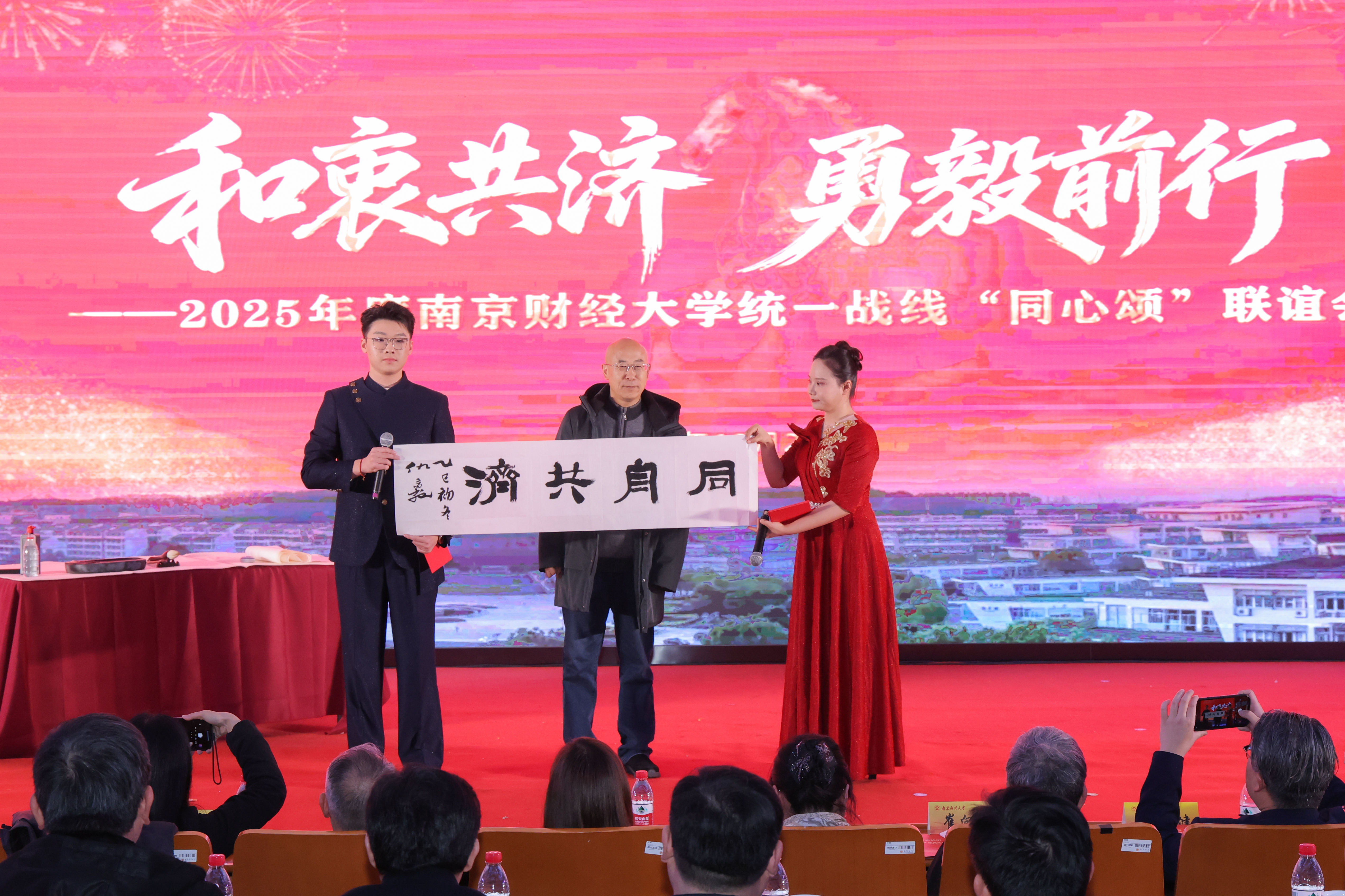 第二阶段为文艺演出。演出以“和衷共济、勇毅前行”为主题,学校各民主党派、统战团体、女教职工舞蹈协会、各民族学生、留学生、离退休老同志、MBA教育中心、新闻与文化传播学院、大学生艺术团精心编排选送了歌舞、朗诵、书法、微电影、传统技艺舞狮、变脸等节目,深情讴歌统一战线凝聚各方力量、同心共筑教育梦的奋进历程,充分展现beat365统战成员多才多艺、昂扬向上的精神风貌。演出中,党委统战部紧扣“和衷共济聚同心”“勇毅前行显担当”两个主题,设置统战知识竞赛和现场抢答环节,将党的二十届四中全会精神、统一战线理论、铸牢中华民族共同体意识及学校第四次党代会精神融入活动中,与会人员在欣赏节目的同时踊跃参与竞答。各民主党派、统战团体成员,各民族学生及留学生代表和校领导共同演唱《团结就是力量》,将现场氛围推向高潮。最后,联谊会在大合唱《明天会更好》中圆满落幕。