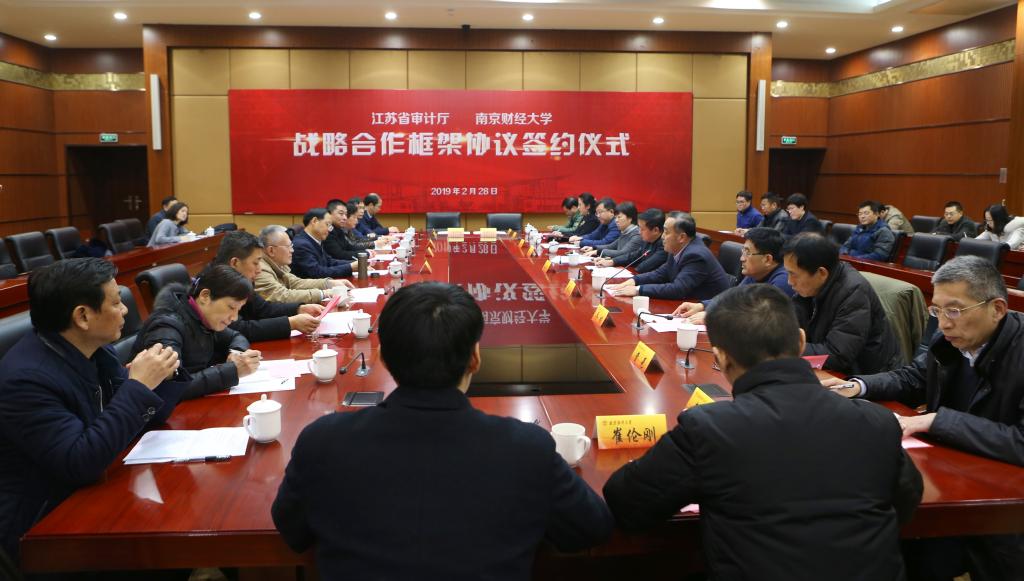程永波校长介绍了学校的发展历史和办学特色,并指出,多年来学校围绕现代服务业尤其是审计事业的重大现实需求,大力加强应用研发、成果推广和政策咨询,为各行各业尤其是为审计行业培养了大批人才。他表示,此次战略合作协议的签署,既是双方长期以来良好合作的丰硕成果,也是新形势下校地双方共同发展进步的内在要求和实现双赢的战略举措。学校将充分发挥在人才培养、科学研究、学科建设、智库构建等方面的特色与优势,更加积极地与审计行业相对接,以管理创新、制度创新、理论创新、实践创新为目标,助推江苏审计事业创新发展,为“强富美高”新江苏建设和江苏“高质量发展走在前列”作出新的更大贡献。