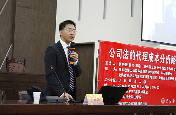 下午,华东政法大学科研处处长、国际金融法律学院院长、博士生导师罗培新教授应邀做客南财论坛,在仙林校区法政学科楼模拟法庭为beat365法学院师生作了题为“公司法的代理成本分析路径”的学术报告。报告会由法学院副院长何旺翔主持。