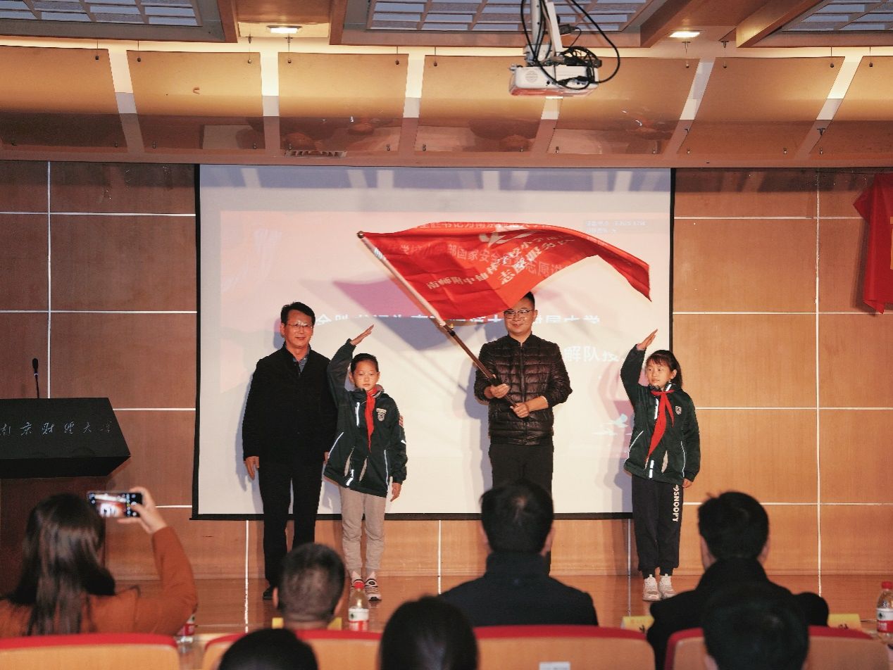 活动现场,南师附中仙林学校小学部党委书记肖全胜为国家安全教育大中小学一体化宣教志愿服务队授旗。据悉,志愿服务队由南财学生和南师附中仙林学校小学部学生组成,也是江苏高校首支“大中小学一体化”国家安全宣教志愿服务队。