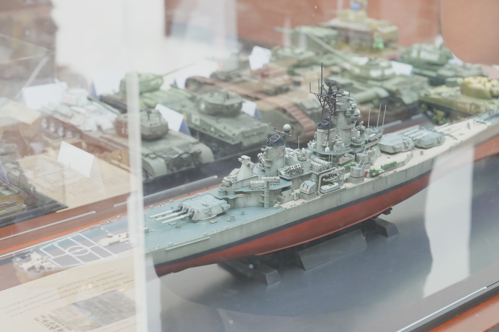 展厅中央还有两组为纪念抗战胜利80周年专门制作的场景模型。作品《南京照相馆:一号坦克在南京保卫战》通过微观场景,刻画中国坦克兵掩护撤离、在弹药告罄时仍驾驶德制一号坦克实施突击的英勇瞬间;“密苏里号”战列舰模型则反映了1945年9月2日,日本政府在该舰上向反法西斯同盟国无条件投降,标志着世界反法西斯战争取得最终胜利,见证了中国人民以巨大的民族牺牲,为拯救人类文明、保卫世界和平作出了重大贡献。