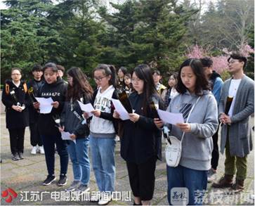 新闻学院则是由分团委书记孙启带领22名学院学生,前往南京雨花台烈士陵园开展了诵读颂清明活动。学生整齐肃立于雨花台烈士群雕像前,诵诗书,怀先烈。领诵齐诵相衬,男诵女诵交辉。对诵感情饱满,诵词由诵读学子独立撰写。回溯历史的词句,或哀婉,或沉痛,申明现状的段落,或慷慨,或激昂。每一位参与诵读的学生,都深深沉浸在悲壮的民族记忆和富强的当下中国之中。学生们极具现场感的诵读引得前来祭扫烈士陵园的各界人士纷纷驻足,其中也有很多人掏出手机记录这令人感奋的瞬间。