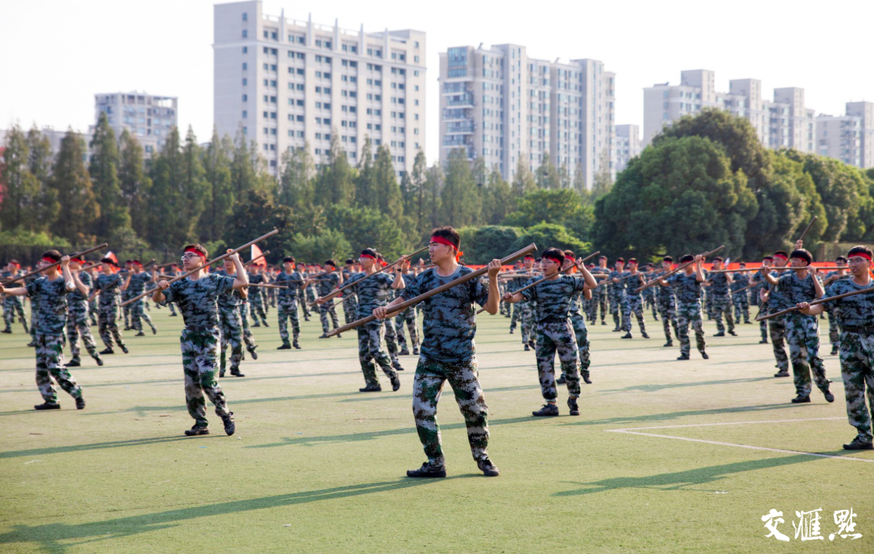 “杀——”,激昂的口号声响彻操场,男子棍术方阵400余人冲上草坪,一招一式都势如雷霆,尽显男儿本色;女子刺杀术方阵接踵而来,巾帼不让须眉,飒爽英姿,一朵朵铿锵玫瑰在操场绽放。