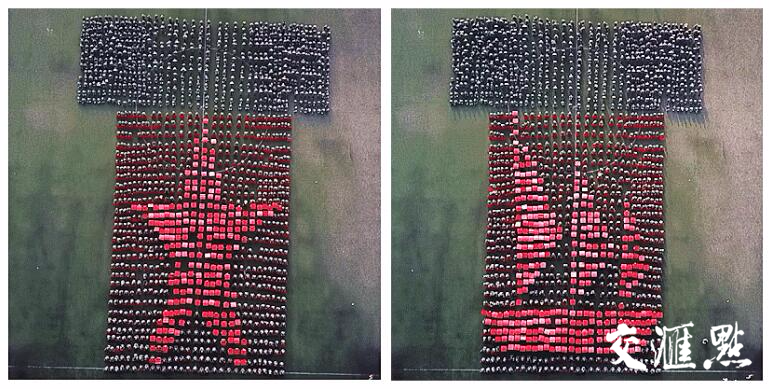 “人生是一条蜿蜒曲折的路,前路漫漫,有彩虹,也有风雨。高考,让我们来到了一个新的十字路口。这时,我们又有了一个新的困惑。到底是向左走,还是向右走。然而你们昂首阔步,选择了向前走!”朗诵词道出了新生初入大学的迷茫、对未来的憧憬、向前进的决心。1600余名新生不断变换队形,摆出小路、箭头、十字路口、帆船、问号等图案,“十字路口”象征着人生路途中所面对的不同选择,“帆船”则昭示着他们的大学新生活即将扬帆起航,乘风破浪!“少年智则国智,少年富则国富,少年强则国强”,最后,伴随着铿锵有力的朗诵,新生们摆出了一颗五角星,戎装少年,志气昂扬。