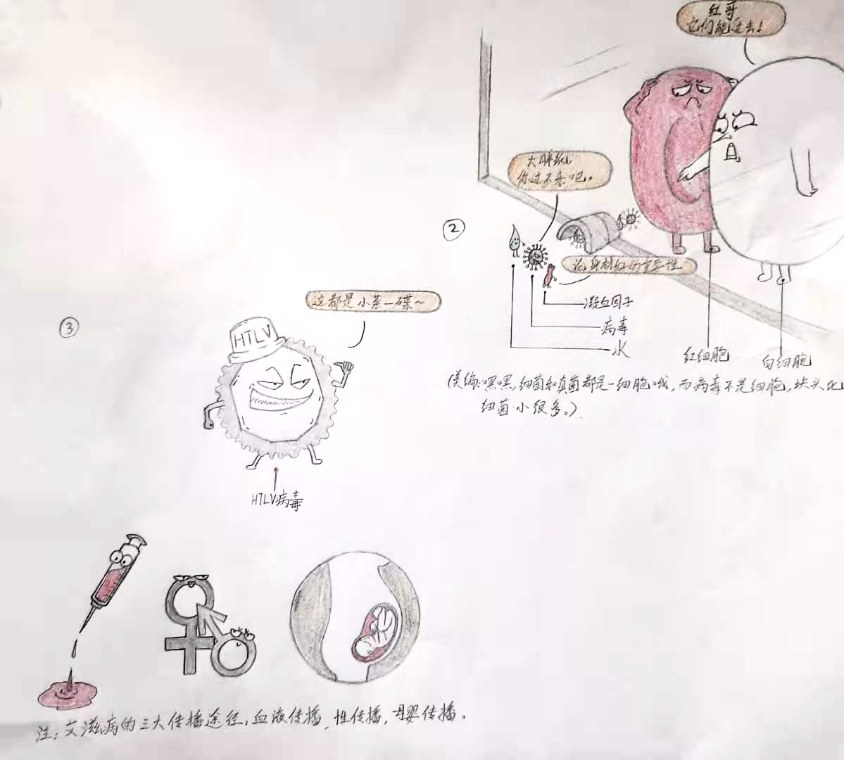 会计学院组织学生手绘防艾漫画进行防艾抗艾知识普及。学生脑洞大开,创意十足,创作出诙谐幽默的防艾漫画作品,将艾滋病毒、免疫细胞拟人化,配以文字对话,形象地展示了艾滋病病毒入侵人体的方式和病毒的危害。漫画活动旨在增强学生的防艾意识,积极响应国家防艾的号召,为爱防艾,共享未来。