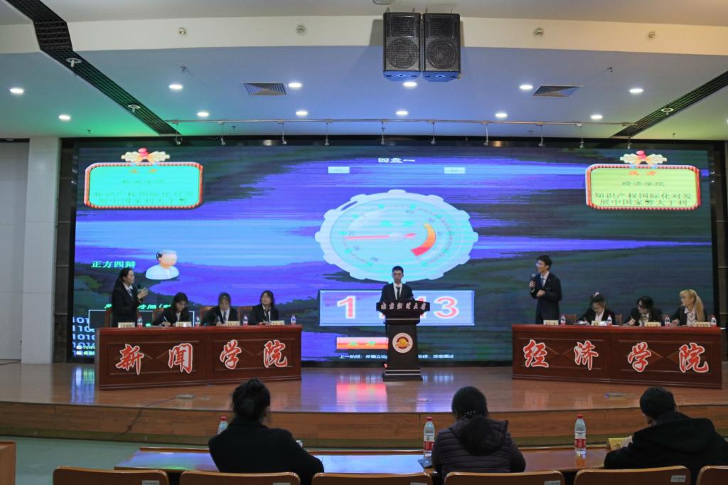 本次辩论赛历时41天,共计24场比赛,18支优秀队伍,经过初赛、复赛、半决赛的层层选拔,新闻学院和经济学院的八名辩手突出重围,脱颖而出,在决赛舞台一决高下。本次比赛采用传统辩论赛制,双方辩手针对知识产权国际化对发展中国家利大于弊(正方新闻学院)还是弊大于利(反方经济学院)展开了激烈辩论。正方新闻学院认为,利弊衡量标准是是否有利于发展中国家科技和经济水平的提高,国与国之间统一而完善的知识产权制度有利于发展中国家引进国际先进技术。反方经济学院则认为,知识产权国际化不仅让发达国家对先进技术的把控更进一步,更导致发展中国家人才流失。在深度阐述和对辩环节中,双方旁征博引,你来我往,互抛难题,步步紧逼。随后,双方更是唇枪舌战,雄辩滔滔。