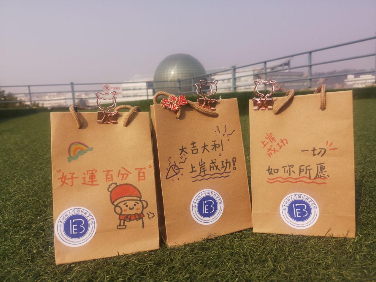 国际经贸学院的同学们精心制作考研福袋,主动“送货上门”。希望在寒冷的日子里,用这一份份满载祝福的考研福袋为考生们送去温暖。其中定制的“国小猫”文件夹小巧精美,以国贸院吉祥物国小猫的卡通剪影为主体,寓意着国贸院伴你同行。同学们还在礼物袋上用绘画和文字表达自己对学长学姐的真挚祝福,“试炼的终点是花开万里”“努力到一定程度幸运自会与你不期而遇”。参与绘制的李林风同学表示:“之前经常在图书馆看到考研的学长学姐们学习的身影,他们为梦想努力的样子真得很激励我,希望我的小小举动能给他们送去鼓励和支持。”收到福袋的考研学子们都格外高兴。商务1701左乾坤同学感慨道:“马上就要踏上考研战场了,在这个特殊的时候收到学院送来的福袋,心里暖暖的,很感谢大家。”