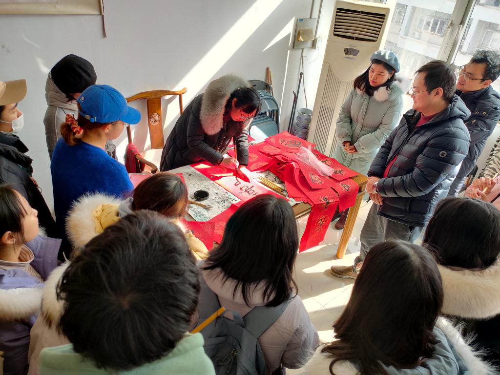 师生们围在一起,在春联上写下新春的祝福,龚月红老师还在现场写下“勇攀高峰再奋进不负韶华展雄风”,这也是全体老师对同学们的寄语。大家在龚月红老师的指导下,也提笔写下“福”字。由于快到期末考试,同学们纷纷跟任课老师们“求”起了“过”“法考必过”“蒙的全对 考的都会”等字样,现场传来阵阵欢乐的笑声。