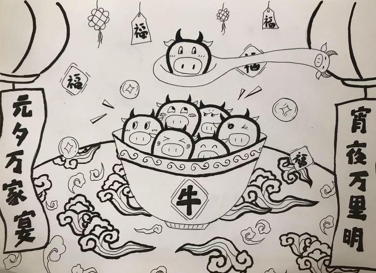 元宵节前夕,同学们便在家中忙活起来。和糯米粉、分剂子、包馅、搓圆裹粉、下水煮熟,从手忙脚乱到熟能生巧,国际经贸学院的同学们和长辈们一起制作着中国传统小吃——汤圆。制作完基础版汤圆,同学们又脑洞大开,用蔬菜给汤圆插上“翅膀”、制作身体,摆成一个个可爱的卡通图案;用馅料给汤圆配上可爱的表情,财子财女们用想象力将汤圆摇身一变,做成了一个个小巧玲珑的软萌小团子。此外,同学们还别具匠心地绘制了牛年特色汤圆。汤圆们在画纸上纷纷化身小牛,配以可爱的牛角满满当当地挤在碗中,象征着新年福气满满,画中的健身小牛也携手“露馅汤圆”祝大家来年牛转乾坤、财气爆棚。参与绘制的霍雨佳同学表示:“汤圆也寓意着团圆,希望大家在这个美好的日子里阖家团圆、幸福美满。”