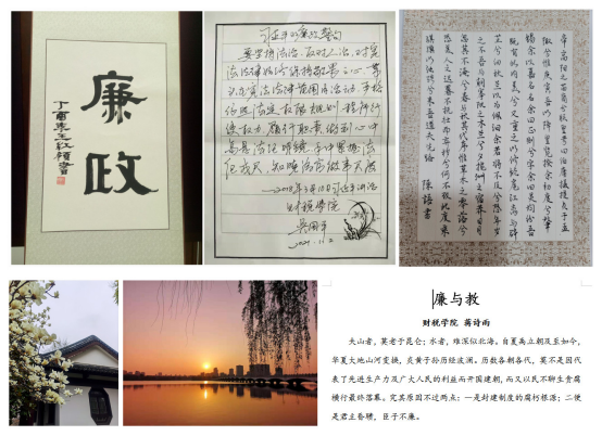本次征集活动共收集到来自全院师生50余份参赛作品,既包括书法、绘画、文学作品,也包括摄影、朗诵等新媒体形式作品,内容丰富、形式多样。学院税务系党支部、副教授吴国平以硬笔书法写下习近平总书记的廉政警句,发人深省;财政系党支部、副教授李婧则以“心向阳光不染尘,便是人间好风景”为灵感,捕捉下石头城傍晚的动人瞬间;教师殷立荣以“莲之出淤泥而不染”为题创作的国画,描绘出莲花的高雅,栩栩如生;学院青年教师蒋诗雨则动之以情,写下《廉与教》一文,“‘廉’者,既可作‘刚正’,亦可谓‘廉洁’”“我们无论身处何位,都必须把正直廉洁铭刻心中,才能身正言直”,表达自己的廉洁决心;税收2003刘英雪同学和财政2002何羿锋同学则共同合作,以饱含深情的朗诵表达了自己对廉洁文化的理解。