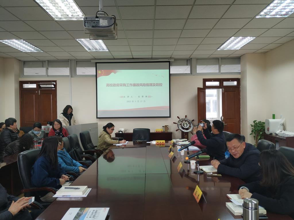 国有资产处副处长、招投标中心副主任庄素娟为大家作了“高校政府采购工作廉政风险梳理及防控”专题讲座。她从采购与招标工作流程出发,为大家讲解了采购与招标中的廉政风险点,并详细介绍了高校政府采购廉政风险的防控对策,提醒大家注意相关事项。陈苏书记表示,要结合高校实际,逐步建立和完善廉政风险防控机制,制定相应防范措施,引导党员干部增强自我防控意识,力争从源头上减少和预防腐败现象的发生。廉政风险防控永远在路上,学院将坚定不移推进党风廉政建设和作风建设,巩固风清气正的良好校园政治生态。