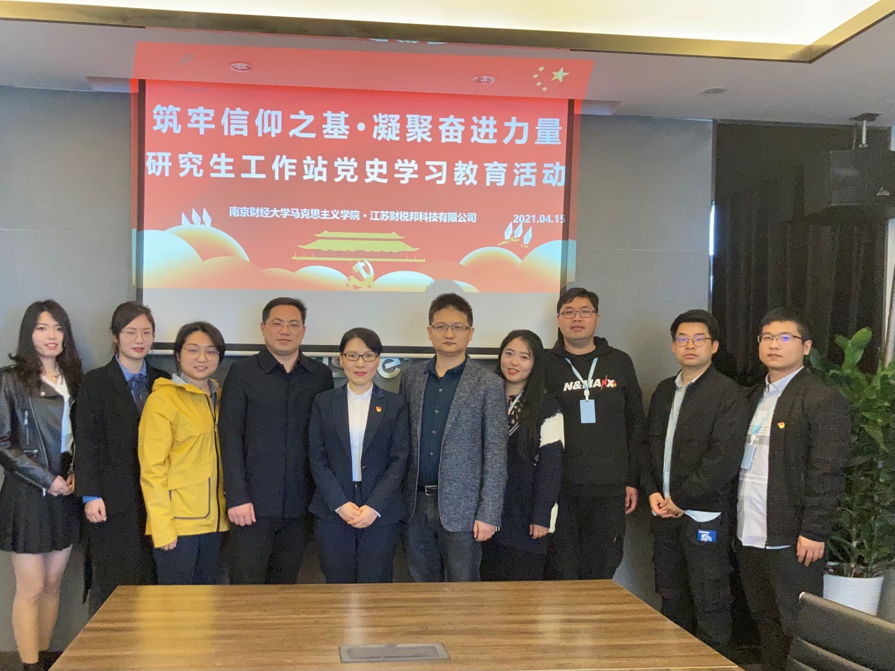 为庆祝中国共产党成立100周年,深入开展党史学习教育,进一步增强研究生理想信念教育,提高校企合作工作实效,4月15日,马克思主义学院与江苏财税邦科技有限公司联合开展“筑牢信仰之基 凝聚奋进力量”研究生工作站党史学习教育。江苏财税邦科技有限公司党支部书记、总经理高霞,马克思主义学院院长助理范渊凯、李飞,江苏财税邦科技有限公司部分党员同志、马克思主义学院部分研究生代表参加活动。