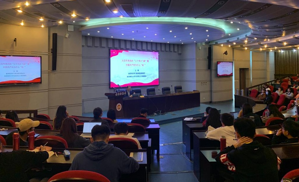 王刚教授以习近平总书记在党史学习教育动员大会上的讲话内容为导语,激励同学们要做到学史明理,学史增信,学史崇德,学史力行。王刚教授以中华民族实现了从东亚病夫到站起来的伟大飞跃、中华民族实现了从站起来到富起来的伟大飞跃、中华民族迎来了从站起来、富起来到强起来的伟大飞跃这“三个伟大飞跃”为框架,详细讲解了新民主主义革命时期、社会主义革命时期中国共产党面对的重大课题,历史和人民为什么选择中国共产党,中国特色社会主义道路“特”在哪里等问题。最后,王刚教授对中国共产党为什么“能”作出总结:一是党的指导思想与时俱进;二是坚持以人民为中心;三是全面从严治党,推进“自我革命”;四是建设“使命型”政党,不断推进马克思主义中国化;五是建立选贤任能机制。