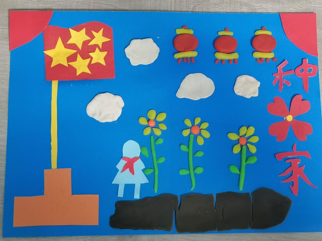 在整幅黏土画元素的选择上,同学们使用了冉冉升空的五星红旗以及与之颜色同样热烈的红色灯笼。炽热的红配上耀眼的黄,不仅奠定了整幅画的颜色基础,使色彩搭配相呼应,更表现出先烈们为国家独立和民族解放的斗争精神,象征着勇敢、真诚和热忱。画作名为“种花家”谐音“中华家”,不仅增添了整幅画的内容,与向日葵这一意象相呼应,更强调了中华儿女对祖国的无限敬意。