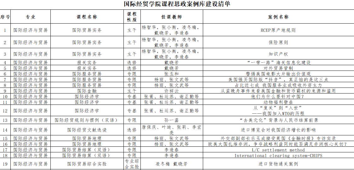 为贯彻落实教育部《高等学校课程思政建设指导纲要》(教高〔2020〕3号)、《省教育厅关于深入推进全省高等学校课程思政建设的实施意见》(苏教高〔2020〕3号)、《beat365英国官方网站课程思政建设实施方案》(南财大党字〔2020〕77号)精神,国际经贸学院本着“坚定学生理想信念,教育学生爱党、爱国、爱社会主义、爱人民、爱集体”主线不动摇的基本原则,要求学院教师结合本专业、本课程的育人要求和目标,通过课程组教学实践和实地调研等方式多渠道挖掘课程蕴含的有效思政教育资源,着力打造优质“课程思政案例库”。