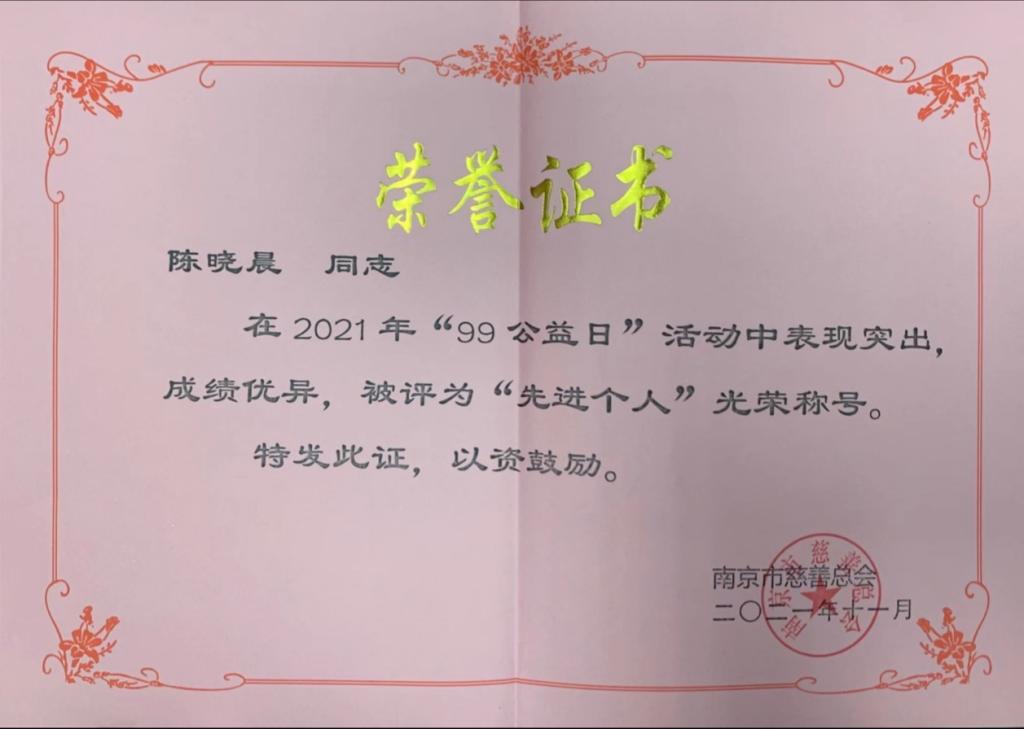近日,南京市慈善总会召开2021年度“99公益日”总结表彰大会,beat365教育发展基金会秘书处陈晓晨在2021年度“99公益日”活动中获评“先进个人”。