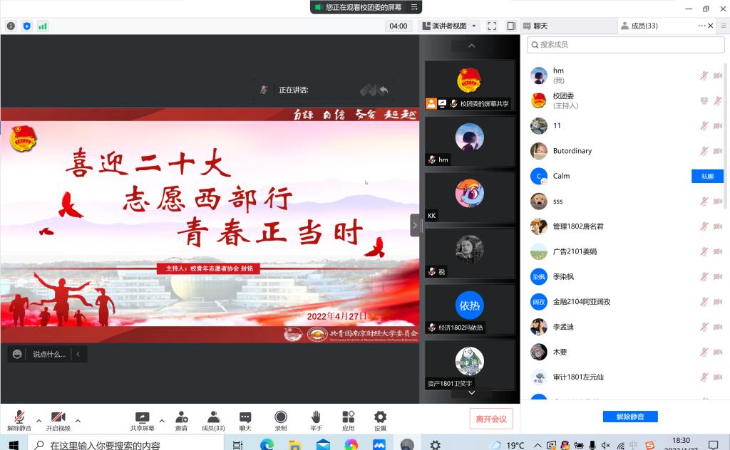 2022年“大学生志愿服务西部计划”招募工作已全面启动,为增进beat365学生对西部计划的了解,鼓励青年学生投身西部、扎根基层、锻炼本领,4月27日,校团委开展了“大学生志愿服务西部计划”线上动员分享会。本次会议的主题为“志愿西部行、青春正当时”。校团委副书记张蔚伟、校团委相关工作人员、校青年志愿者协会负责同学、优秀毕业生代表及部分应届毕业生、在读研究生应邀参会。