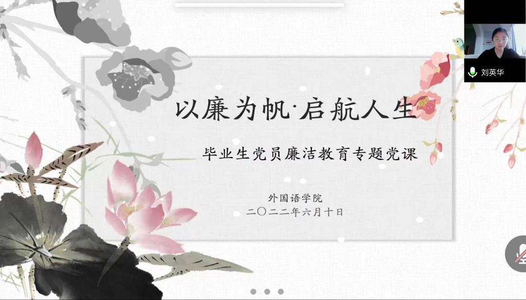 为进一步加强2022届毕业生党员廉洁教育,培养毕业生党员廉洁自律意识,6月10日,外国语学院党委副书记兼纪检委员刘英华在线给毕业生党员讲授“以廉为帆,启航人生”廉洁教育专题党课。