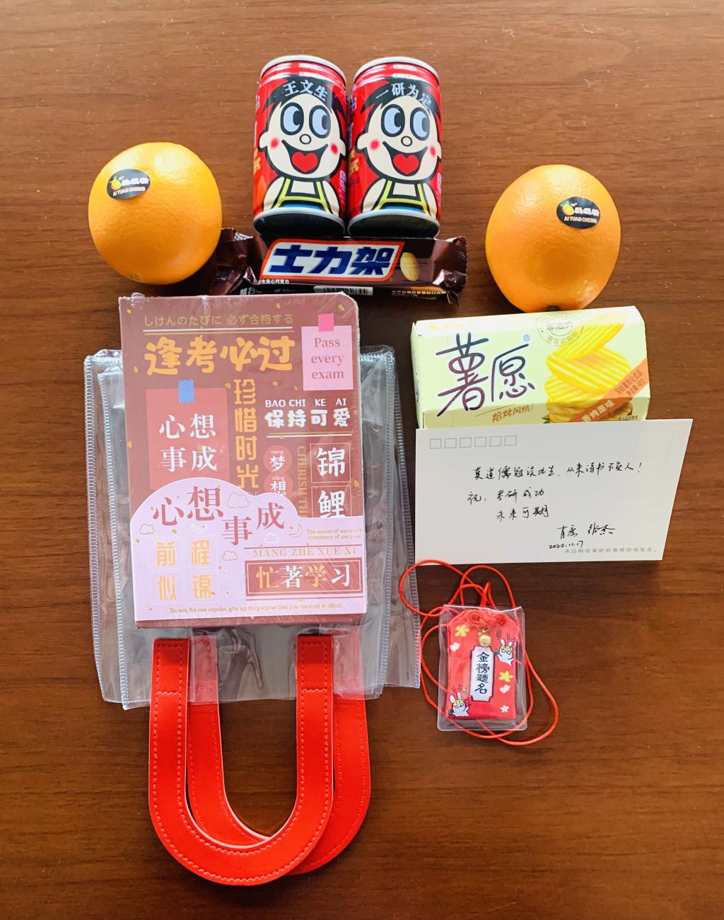 “一研为定”专属暖心礼包,处处充满美好寓意,也充满学院及老师们的祝福和期盼。老师们亲手将脐橙、薯愿薯片、专属旺仔牛奶、笔记本、锦囊等装进每个人的礼包袋,并放入手写的鼓励卡:“星光不负赶路人,时光不负有心人”“你的未来藏在你现在的努力里”“放轻松去迎接挑战,你是最出色的”……