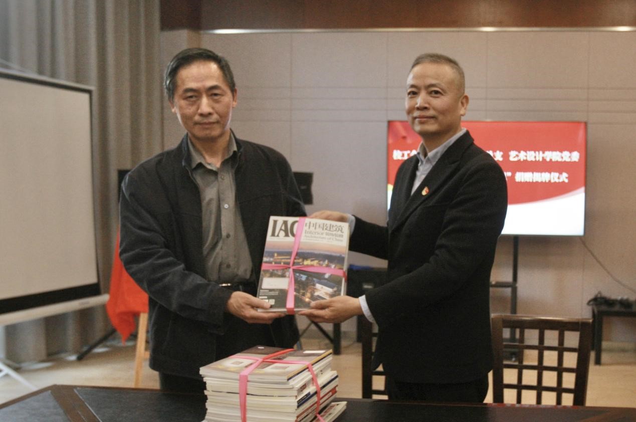 张春法馆长代表图书馆向“艺苑读吧”捐赠艺术类书刊,许蚌副院长代表学院接受捐赠。