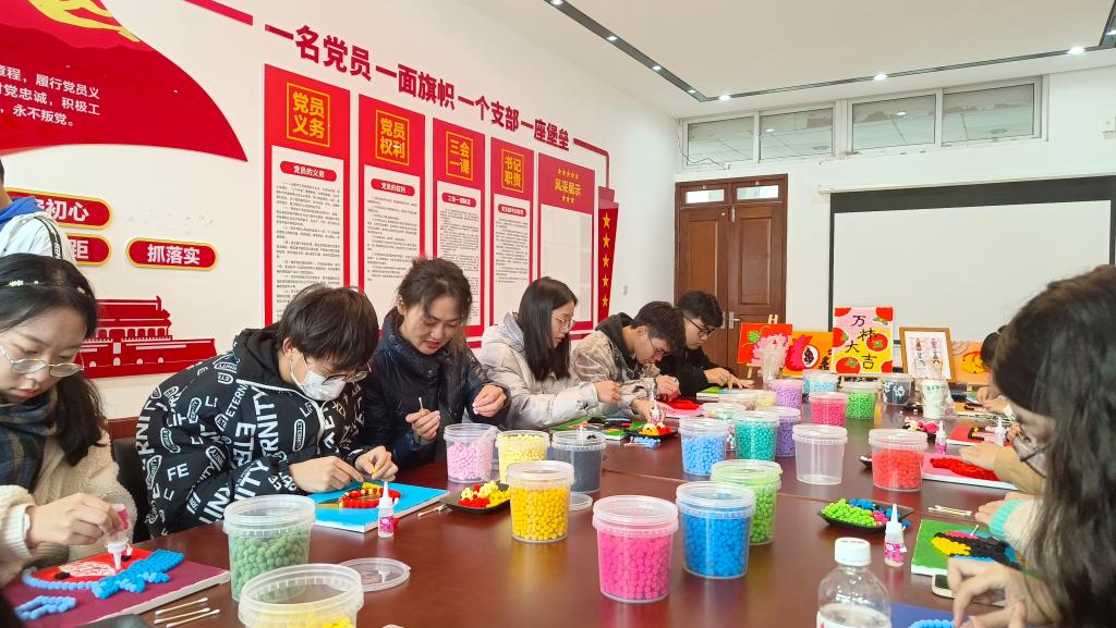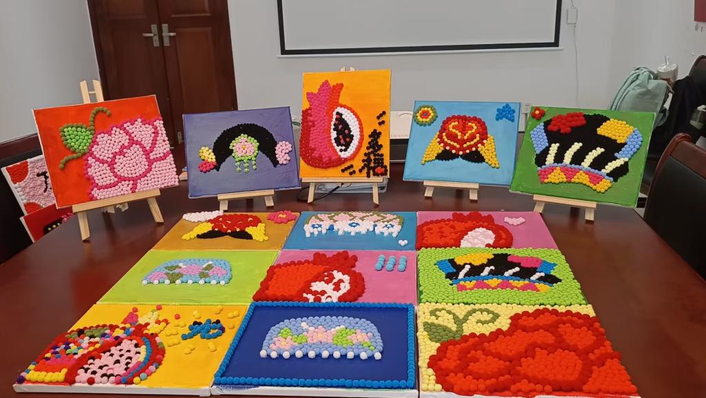 活动伊始,同学们认真聆听毛球画的制作步骤和工具使用方法。随后,大家结合主题,通过画、拼、贴等方式将一颗颗小毛球变成了一幅幅寓意深刻、精美雅致的作品。有土家族的特色花纹、有维吾尔族的小花帽,更多的是各式各样的石榴花、石榴籽,这些别致有趣的作品饱含着少数民族学子对美好生活的感受与民族团结的深情厚谊。