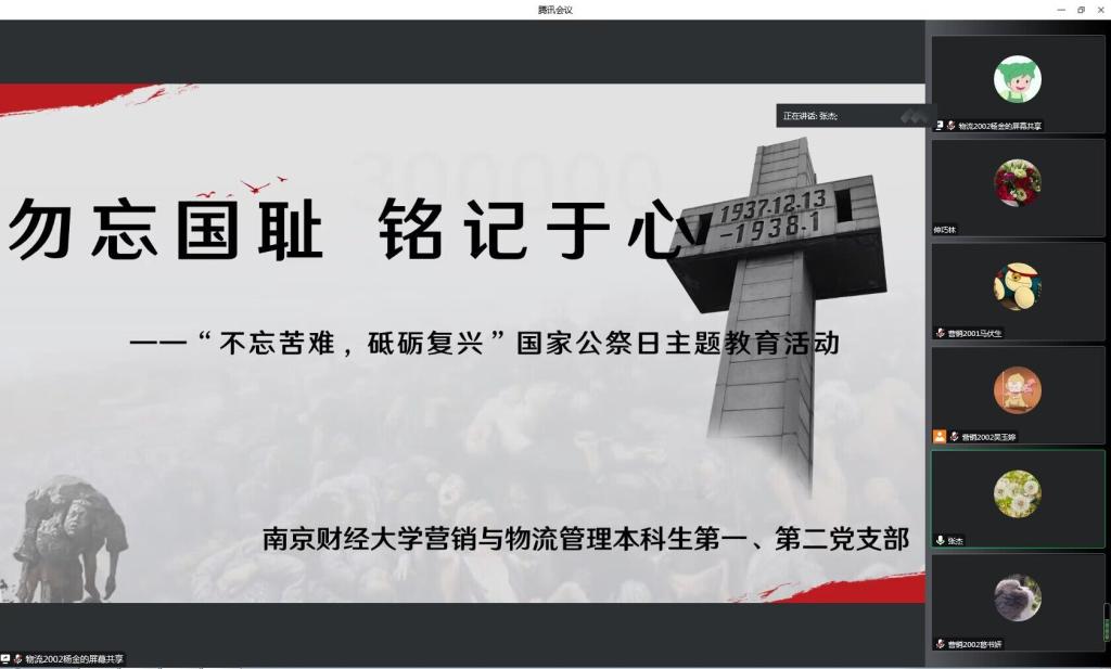 12月13日,营销与物流管理学院本科生第一、二党支部通过线上形式开展了“不忘苦难,砥砺复兴”国家公祭日主题活动。营销与物流管理学院党委副书记张杰,本科生第一、二党支部书记仲巧林、肖密及支部全体党员参加活动。在防空警报声中,全体党员肃立,沉痛默哀,悼念在南京大屠杀中死难的同胞以及英勇就义的革命英烈。怀着沉痛的心情,师生党员一起诵读《和平宣言》,发出对和平的呼唤。全体党员观看南京大屠杀相关的历史纪录片,一张张褪色的黑白历史照片带领同学们走进那段历史,沦陷、屠杀、救援、审判、铭记,历史的悲鸣萦绕心间,久久不散。在“对话遇难者”环节,学生党员朱嘉敏在国家公祭网上写下和平祈愿,愿和平的曙光洒满人间。青年党员纷纷表示将厚植爱国情怀,铭记这段屈辱历史,踔厉奋发,勇毅前行,并为中华民族伟大复兴、世界和平发展贡献青春力量。