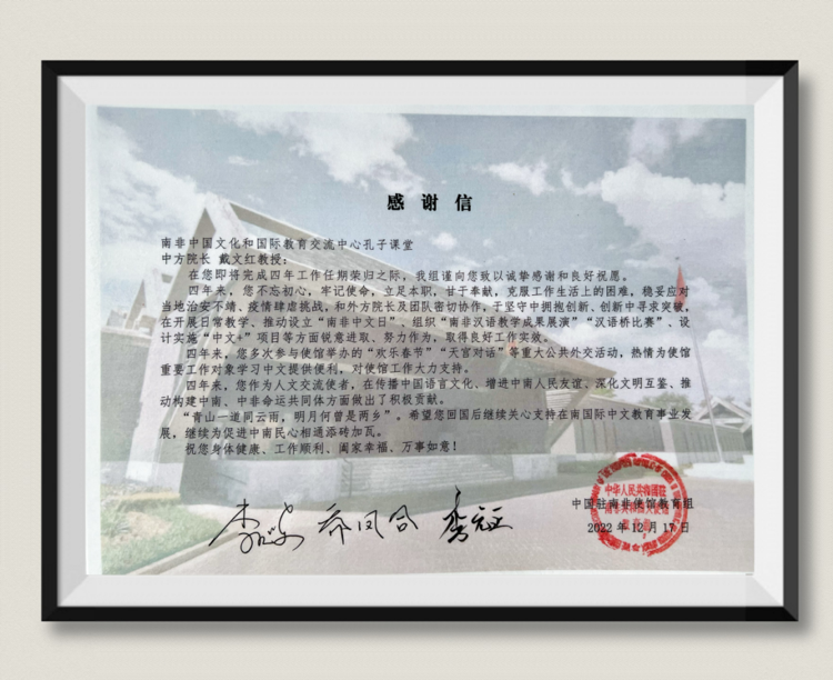 中国驻南非大使馆教育组教育参赞及两名外交官为戴文红教授践行,对其在任期间的工作成效给予了充分赞赏和肯定,并赠予《感谢信》。信中列举了戴文红教授四年来为南非中国文化和国际教育交流中心孔子课堂以及在传播中国语言文化、增进中南人民友谊、深化文明互鉴、推动构建中南、中非命运共同体方面作出的贡献,并希望戴文红教授回国后继续关心支持在南国际中文教育事业发展,继续为促进中南民心相通添砖加瓦。