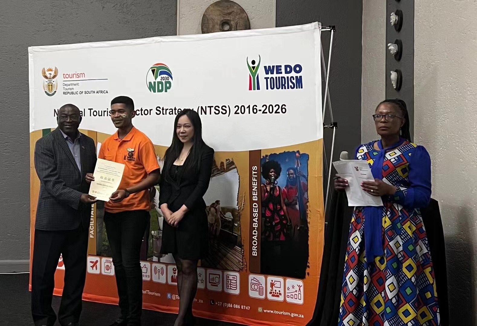 2022年南非导游培训结业典礼上戴文红教授和南非旅游部副部长一起为学员发结业证书