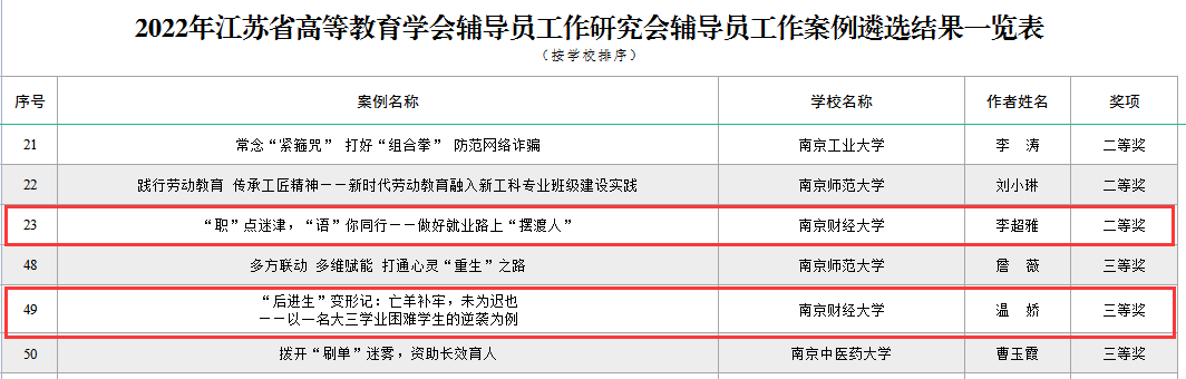 近日,江苏省高等教育学会辅导员工作研究委员会公布2022年辅导员工作案例遴选结果和专项课题立项结果。beat365外国语学院辅导员李超雅撰写的《‘职’点迷津,‘语’你同行——做好就业路上‘摆渡人’》、会计学院辅导员温娇撰写的《‘后进生’变形记:亡羊补牢,未为迟也——以一名大三学业困难学生的逆袭为例》分别获工作案例评比二等奖和三等奖,会计学院辅导员王甜莉申报的《信息时代大学生法治意识培养路径分析》获批指导项目。