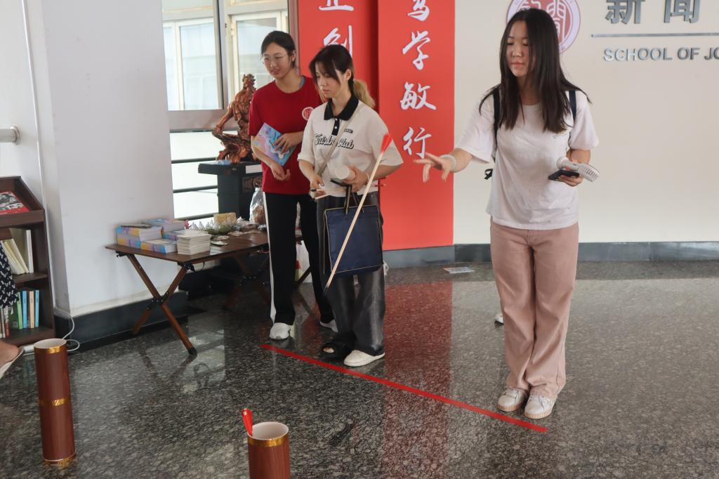 走进新闻学院,“萌新”们就感受到了浓浓的人文气息和别出心裁的报到体验。学院为前来报到的新生精心准备了非物质文化遗产传统投壶小游戏。在鼓励的掌声中,同学们拿起壶矢,瞄准壶口,试探着往前投掷,“好样的!投中了!”一声声喝彩,令原本初来乍到的胆怯和紧张一扫而光。投壶结束,每一位新生都会抽取到包含学长学姐祝福寄语的明信片盲盒。在一张张方正的明信片上,或一笔一画,或流利潇洒,有“前途似锦”的祝福,有“努力学习”的勉励,有“相约未来”的邀请……除此之外,学长学姐在明信片上留下了自己的联系方式,希望可以帮助新生快速熟悉校园环境并适应大学学习生活。