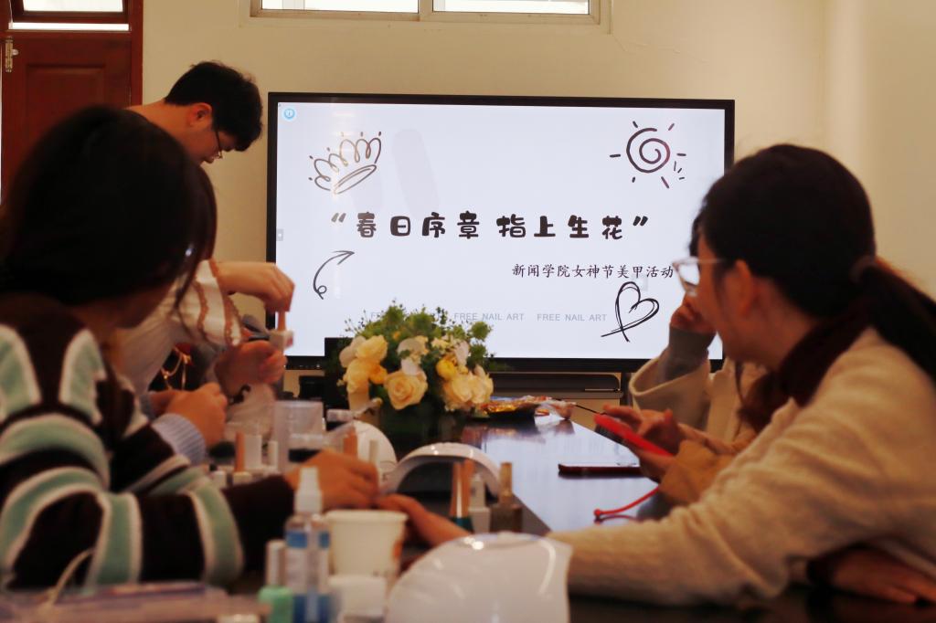 新闻学院组织开展“春日序章 指上生花”趣味美甲活动。学院学生变身美甲师,用充满春意的亮丽色彩,为女老师点缀指尖、愉悦心情。学院还邀请体育部卞伟伟老师为老师们带来一场别开生面的舞蹈教学。