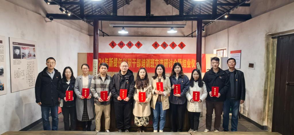 现场参观学习结束后,全体学员在原国华初级中学参加培训班交流研讨会暨结业仪式。机关科职干部、组织员、分团委书记、学工办主任、教务科研办公室主任等5位学员代表,依次上台交流培训学习感悟。徐刚书记和章冬斌副书记分别为学员代表颁发结业证书。
