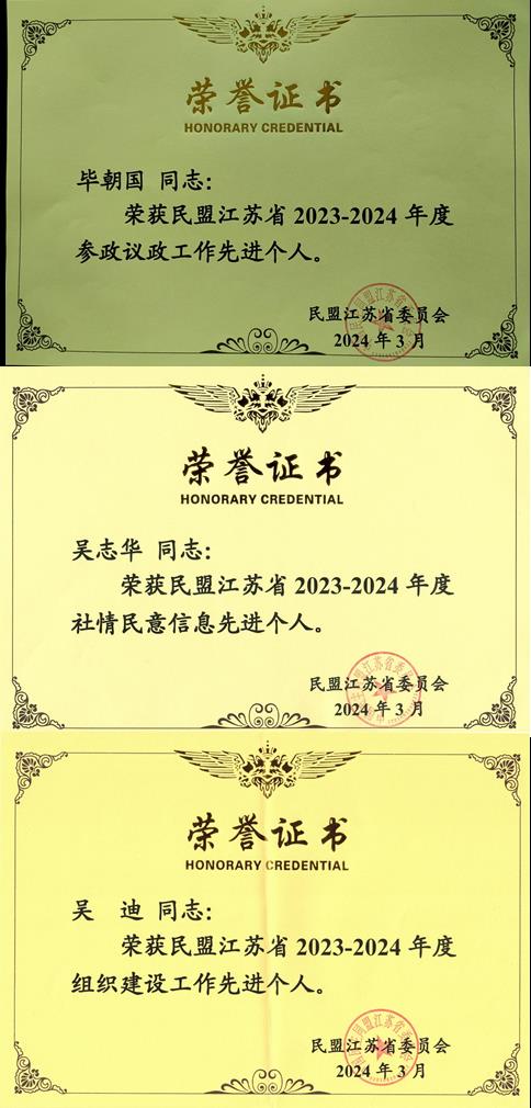 3月18日,民盟省委会2024年度盟务工作会议暨第一次盟务工作专题研讨会在南京召开。会上,民盟省委会表彰了民盟江苏省2023-2024年度先进集体和先进个人。beat365毕朝国、吴志华、吴迪等三位盟员分别获评“参政议政工作先进个人”“社情民意信息先进个人”“组织建设工作先进个人”。此外,在民盟江苏省委省直基层组织测评中,beat365民盟委员会获评“优秀基层组织”。