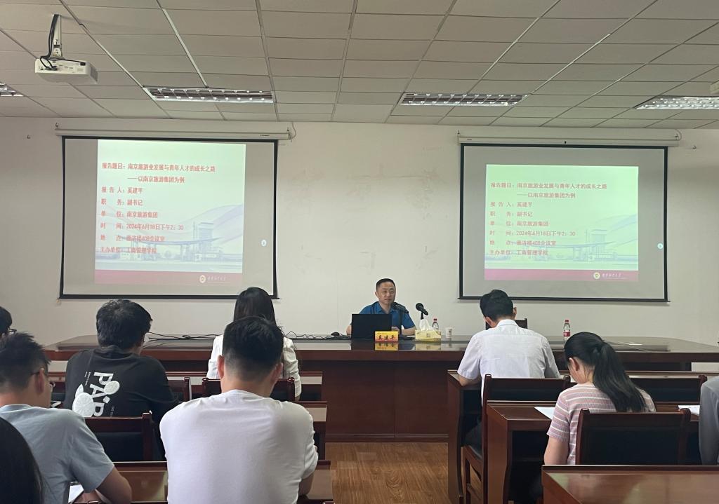 讲座围绕南京旅游集团的基本情况、文旅项目、管理实践和人才成长等方面展开。奚建平副书记以熙南里街区、水木秦淮艺术街区等文旅项目为例,生动展示了集团在文化旅游领域的创新实践和成功经验,为如何打造文化旅游项目提供了宝贵经验。围绕三项制度改革的推进、高质量党建工作的开展、人才战略力量的培育等内容,奚建平副书记对集团的管理工作实践展开详细讲述。从人才成长角度出发,他向同学们提出加强政治素养、确立人生目标、全方位塑造自身的建议。他强调,全方位塑造自身,应重点培养持续学习能力、组织能力和沟通能力,如此才能适应当下时代的飞速发展、增强自身的就业竞争力。