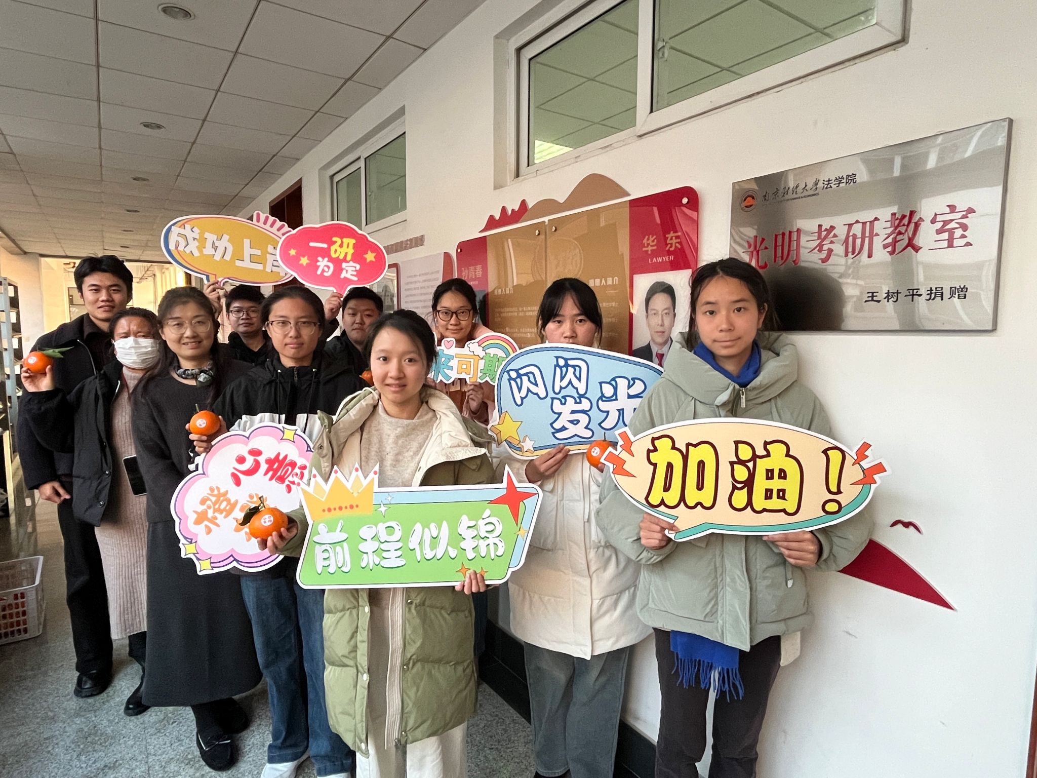 法学院开展考研动员会暨慰问活动。学院领导询问同学们的复习进度、备考情况,希望同学们在最后的关键时期能抓紧时间、坚定信念,同时保持良好的心态,劳逸结合、张弛有度,考出好成绩。学院老师为同学们发放寓意“心想事‘橙’、‘橙’功上岸”的橙子,祝愿每一位学子都能实现考研梦想,高分上岸。