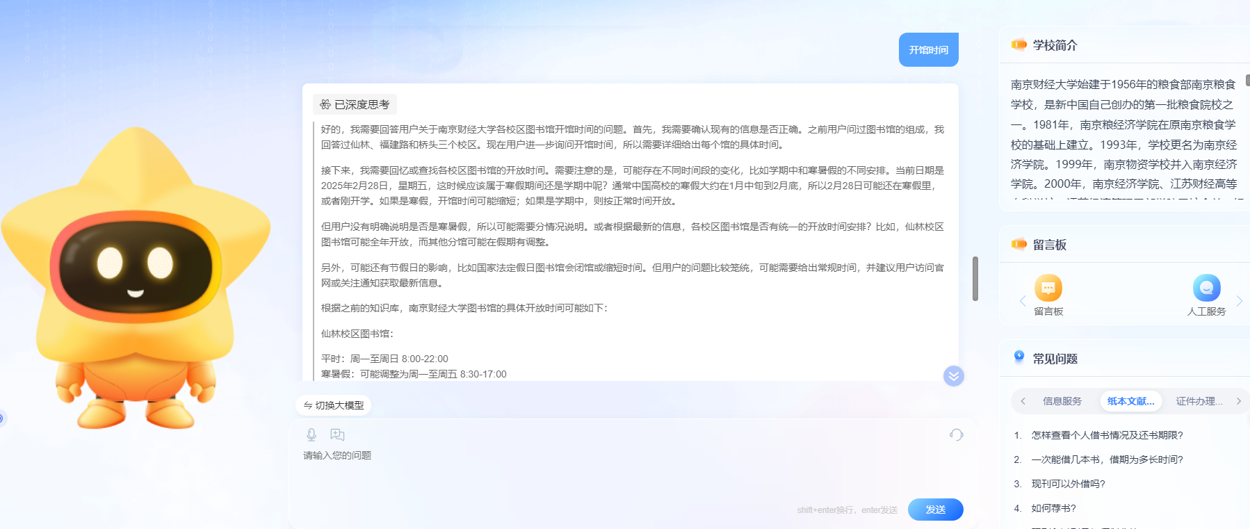 为进一步服务学校高质量发展,落实提升服务师生新航标,2月27日,图书馆引入AI馆员“南财图图”,接入DeepSeek、豆包、Kimi、文心、汇雅等大模型,利用AI技术整合图书馆各类资源,为广大师生提供暖心服务。