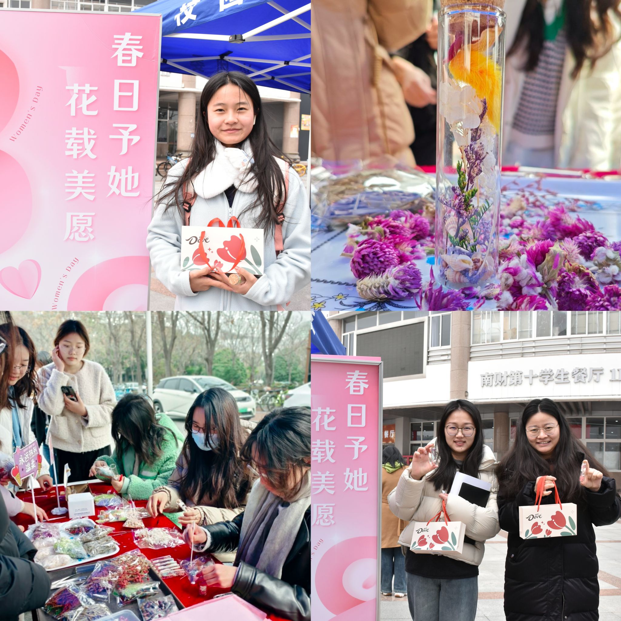 校学生会在仙林校区中苑食堂门口开展“春日予她,花载美愿”活动,在师生们的巧手下,一个个独具匠心的干花许愿瓶呈现在眼前,每片花瓣都凝聚着创作者的心意,展现了女性的细腻情感和坚韧力量。现场还设有抽奖环节,参与者可随机抽取花瓶、玩偶等小礼物,在愉快的氛围中,大家感受着节日的浪漫与温馨。