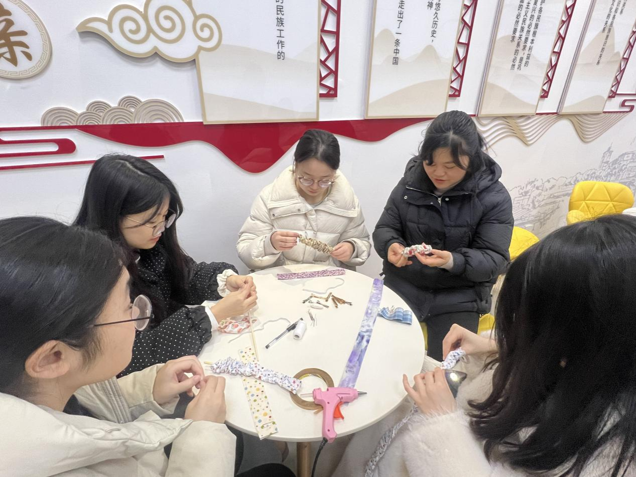 工商管理学院女教职工与少数民族学生代表一起,在一针一线的创作中,将少数民族文化元素与古典审美相融合,制作出兼具实用性与艺术性的国风包;非遗押花艺术创作活动中,同学们将传统植物拓印技法与心理画结合,创作出承载自我认知的押花相框,实现传统文化浸润与心理健康教育的有机融合。